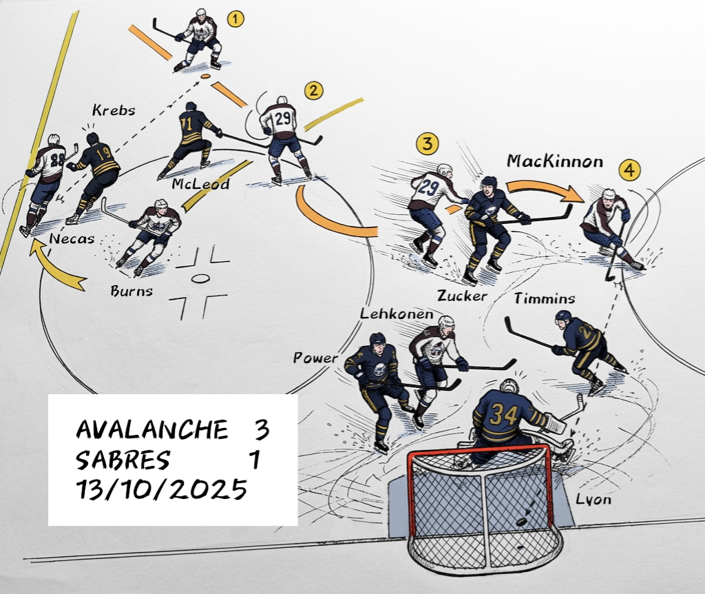 - Codice 01: il gol di Nathan MacKinnon al minuto 03’14” per il vantaggio di Colorado su assistenza di Necas e Burns, nel match Buffalo Sabres – Colorado Avalanche 1-3 (1-1, 0-2, 0-0) del 13/10/2025.