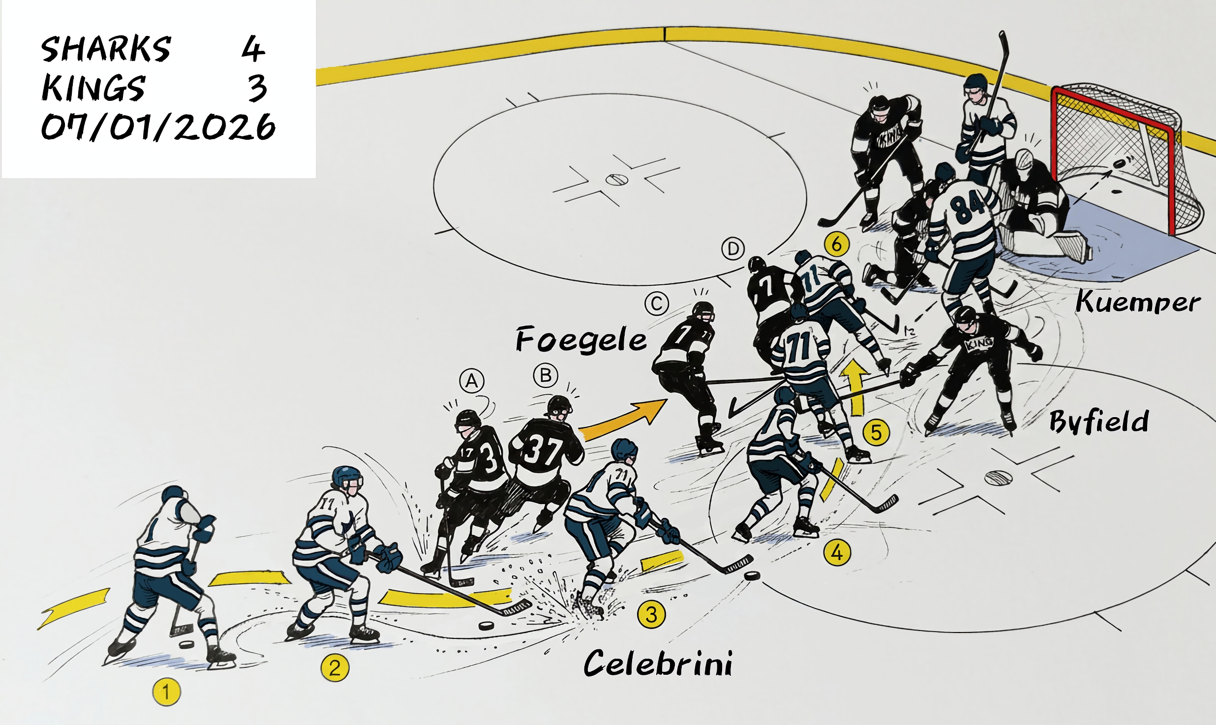 - Codice 03: il gol del pareggio 3-3 degli Sharks segnato al minuto 58’53 da Macklin Celebrini nel match Los Angeles Kings – San Josè Sharks 3-4 ds (0-0, 1-1, 2-2; 0-1) del 07/01/2026.