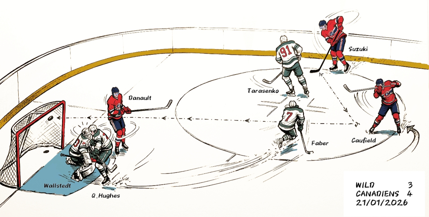 - Codice 04: il gol vittoria a favore dei Canadiens firmato da Cole Caufield al minuto 59’45 su assistenza di Suzuki ed Hutson, nel match Montreal Canadiens – Minnesota Wild 4-3 (2-1, 1-1, 1-1) del 21/01/2026.