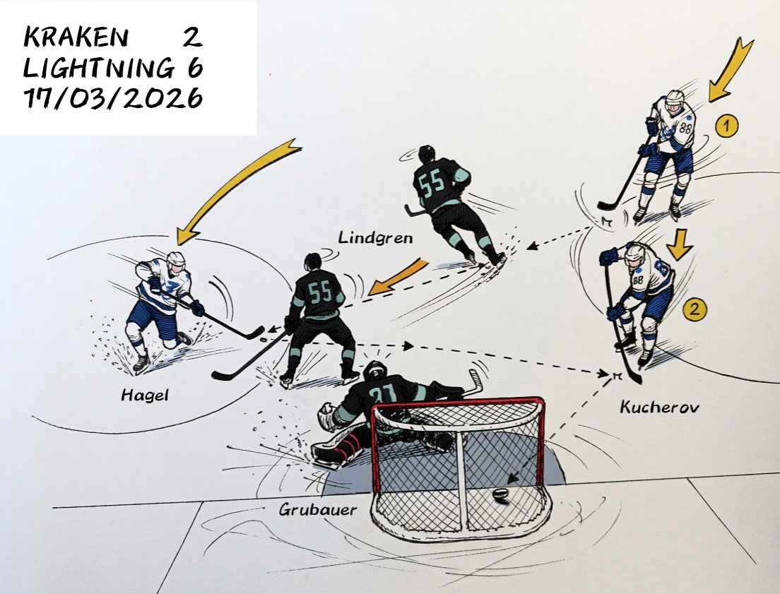 - Codice 05: il gol del momentaneo 2-0 a favore di Tampa Bay realizzato al minuto 18’49” da Nikita Kucherov su assistenza di Hagel, per il primo dei tre gol messi a segno dall’attaccante russo nel corso del match Seattle Kraken – Tampa Bay Lightning 2-6 (0-2, 2-1, 0-3) del 17/03/2026.