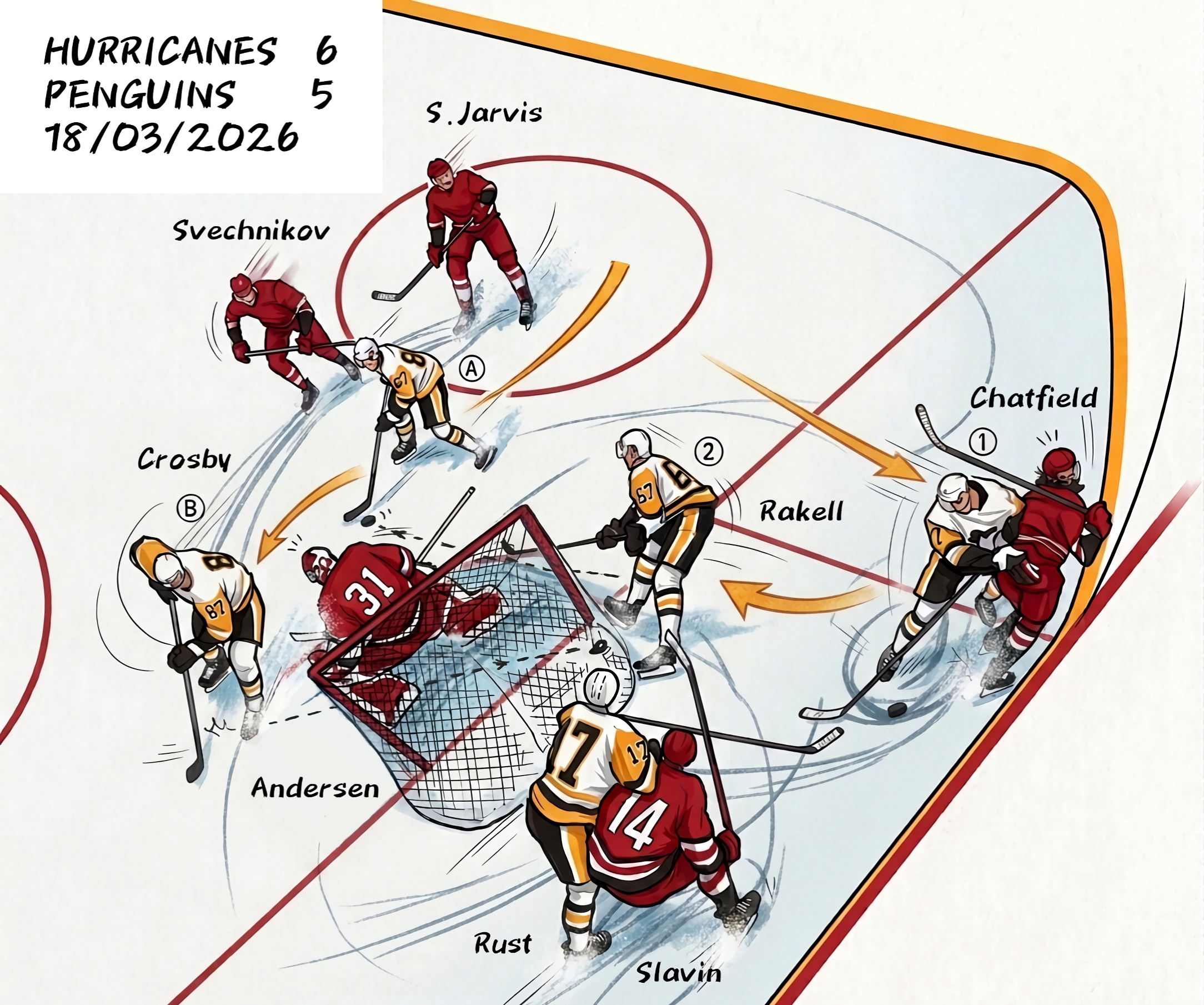 - Codice 06: il gol di Sidney Crosby del momentaneo 1-1 dei Penguins siglato al minuto 29’57” su assistenza di Rakell e Karlsson nel match Carolina Hurricanes – Pittsburgh Penguins 6-5 ds (1-0, 1-1, 3-4) del 18/03/2026.