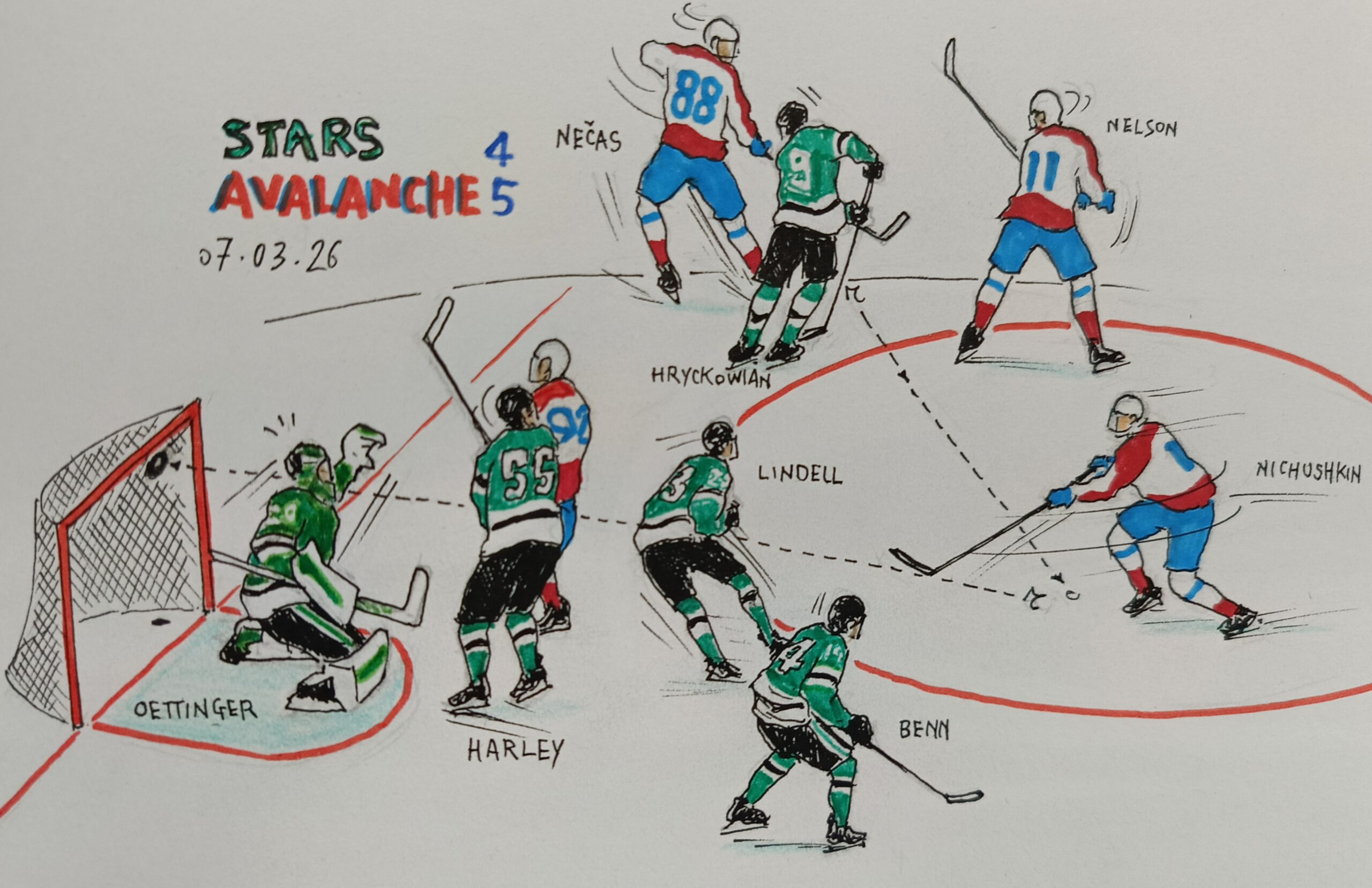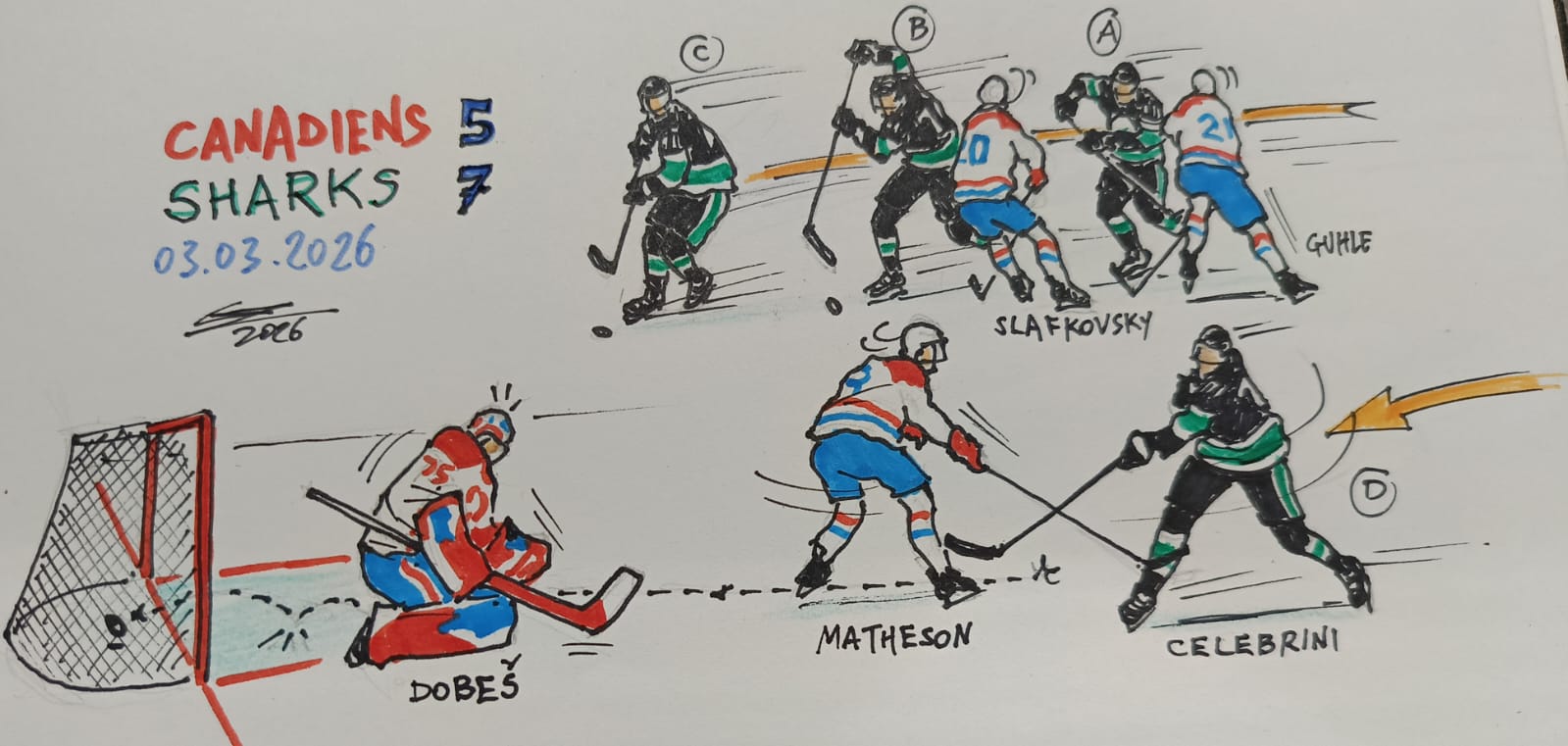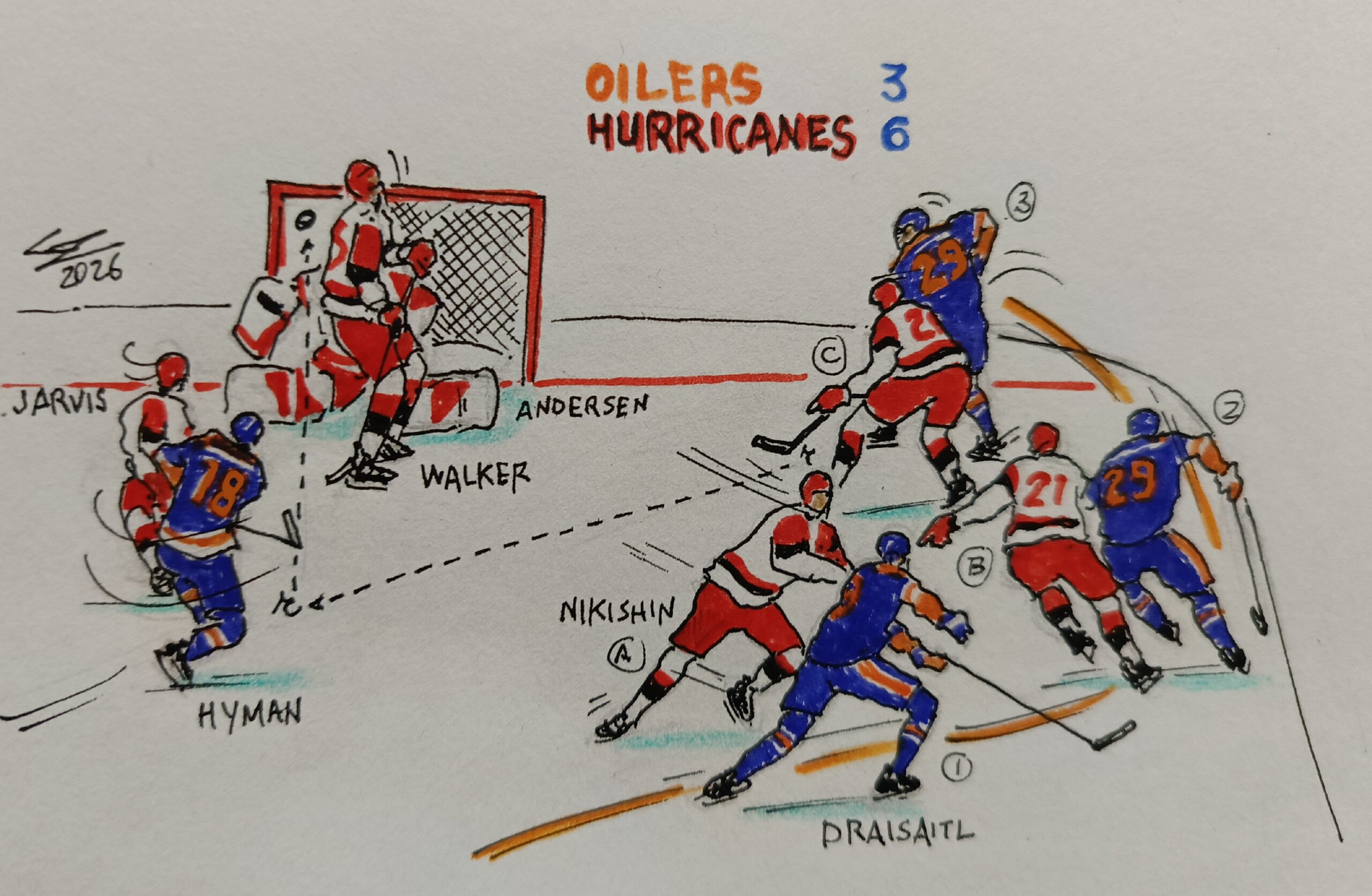 Con riferimento alla galleria grafica realizzata da Giovanni Zuntini, da sinistra a destra, troviamo la 30.esima rete stagionale del 19.enne attaccante canadese Macklin Celebrini a segno al 38’23” nel momentaneo 3-2 del match che in data 4 marzo hanno visto i San Josè Sharks superare gli Edmonton Oilers per 7-5 (1-1, 3-1, 3-3), la rete del momentaneo 3-4 segnata dal 31.enne attaccante canadese Zach Hyman al minuto 31’43” del match del 7 marzo fra Edmonton Oilers e Carolina Hurricanes poi concluso sul 3-6 finale (1-2, 1-1, 1-3) e la rete del 4-4 segnata al 59’45” dal 31.enne attaccante russo Valeri Nichushkin che è valso il prolungamento della sfida del 7 marzo fra Dallas Stars e Colorado Avalanche terminata poi 4-5 dopo i rigori (3-2, 1-1, 0-1; 0-0; 0-1).